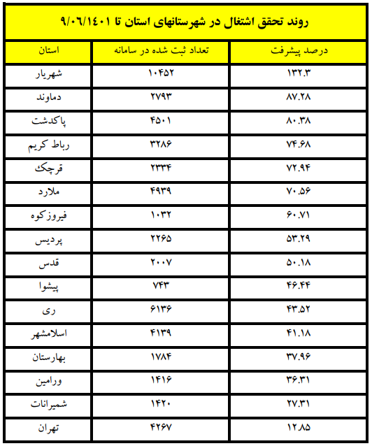 بنابراین گزارش آمار اعلام شده تا نهم شهریور ماه 1401 می باشد که شهرستان های ری و ملارد رتبه های دوم و سوم تعداد اشتغال ثبت شده در سامانه را در اختیار دارند.