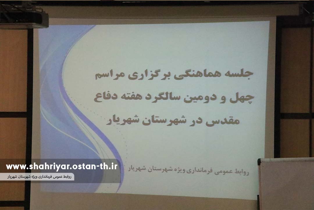 دکتر شفیع زاده فرماندار ویژه شهرستان شهریار در جلسه هماهنگی ستاد گرامیداشت هفته دفاع مقدس، این هفته را هفته تبیین، ترویج و حفظ ارزش های دفاع مقدس نامید.