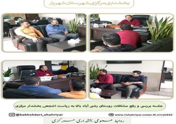جلسه بررسی و رفع مشکلات روستای رضی آباد بالا به ریاست اشجعی بخشدار مرکزی و با حضور صحرا گرد مسئول دفتر فرماندار شهرستان شهریار و دهیار و اعضای شورای اسلامی روستای رضی اباد بالا در محل بخشداری مرکزی برگزار شد.